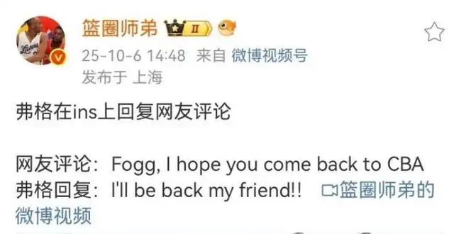 弗格在拒绝了山东男篮的合同后,就没有了下文,根据媒体人报道,弗格在和球迷的互动中,确定会重返CBA赛场,但拒绝球队没有透露,有传闻会加盟江苏男篮。